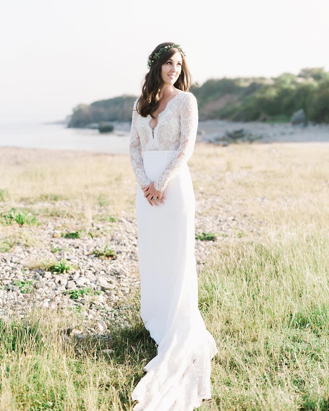 Long lace sleeves, a plunging neckline, and a simple skirt that trails over pebbled shoreline, this look feels grounded and poetic. The floral crown adds that organic element that ties everything back to nature.