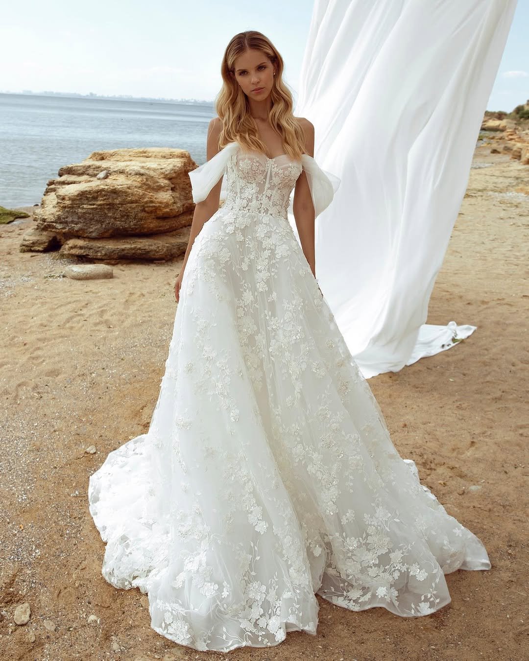 There’s a certain magic to an off-the-shoulder lace gown paired with a cathedral-length veil on a quiet beach. The intricate detailing hugs the silhouette, while the veil trails behind like a soft cloud caught in motion. It’s refined, but it still feels natural against the pebbled shore and rolling waves.