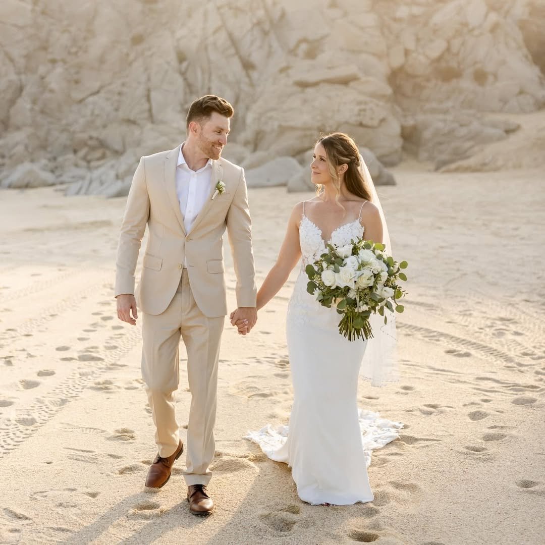 Walking hand in hand through the sand, this look feels grounded yet elevated. It’s that perfect blend of intimacy and grandeur, like an elopement that still carries red carpet energy.