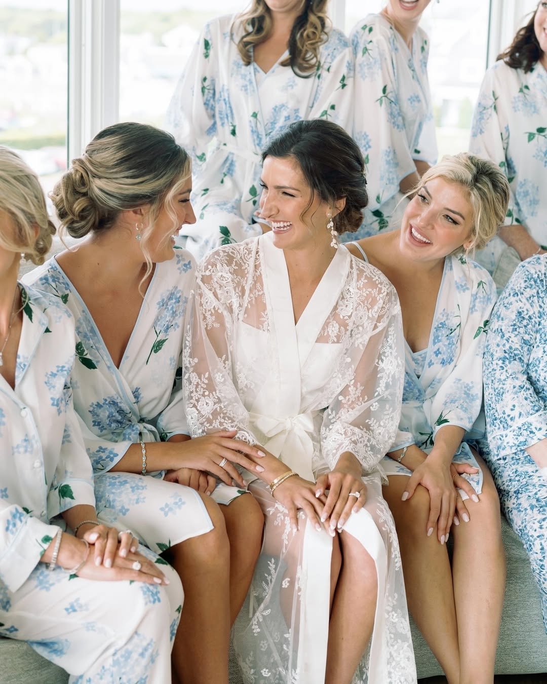 There’s magic in those quiet, pre-ceremony moments, especially when the bride is wrapped in lace and surrounded by bridesmaids in airy blue florals. The sheer robe layered over a simple slip feels romantic and intimate, almost like a nod to the sea’s soft palette.