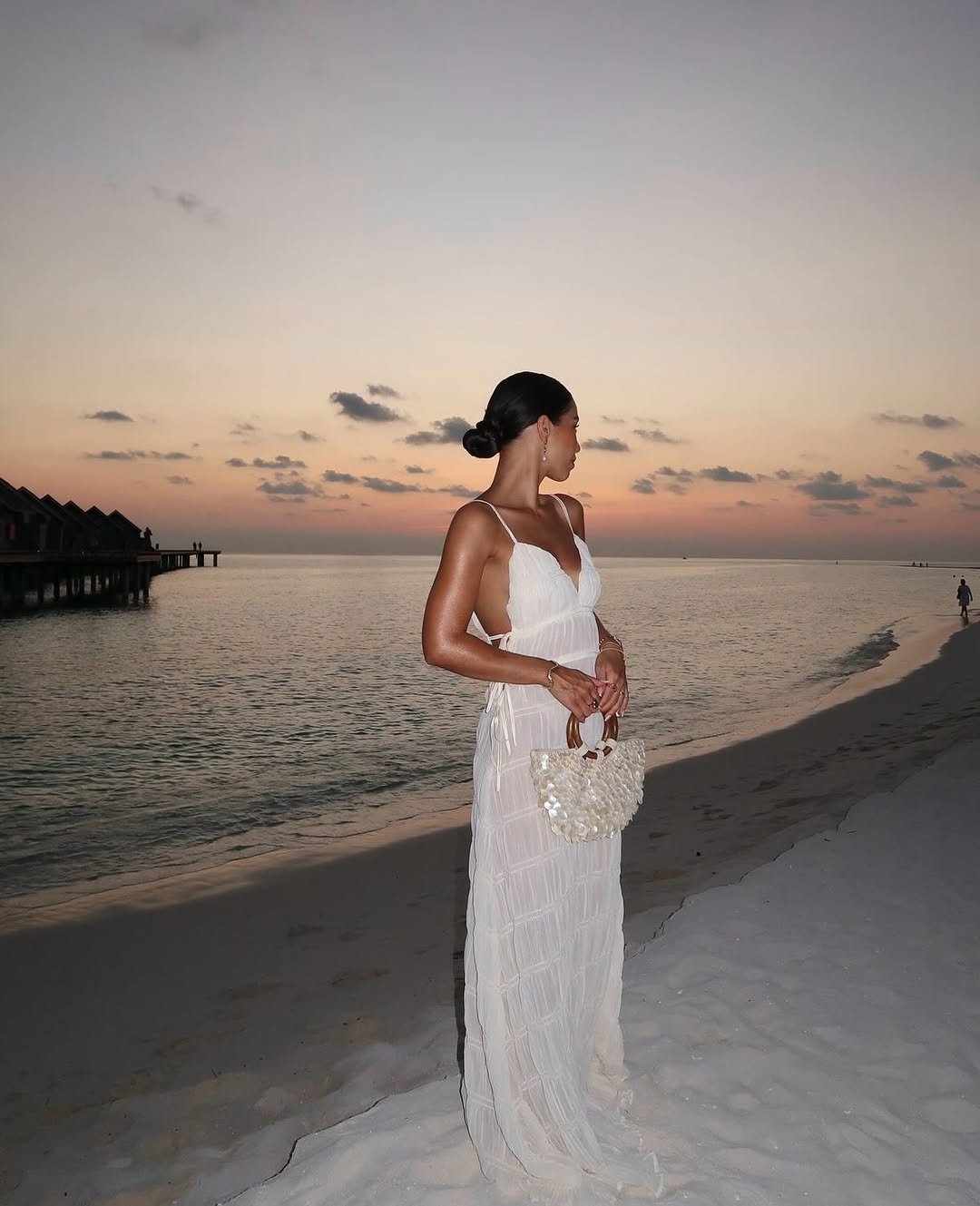This final look is all about quiet allure. The low back, delicate straps, and textured fabric feel intimate, especially against a fading pink sky. Holding a petite clutch, she looks less like she’s posing and more like she’s simply living the moment.