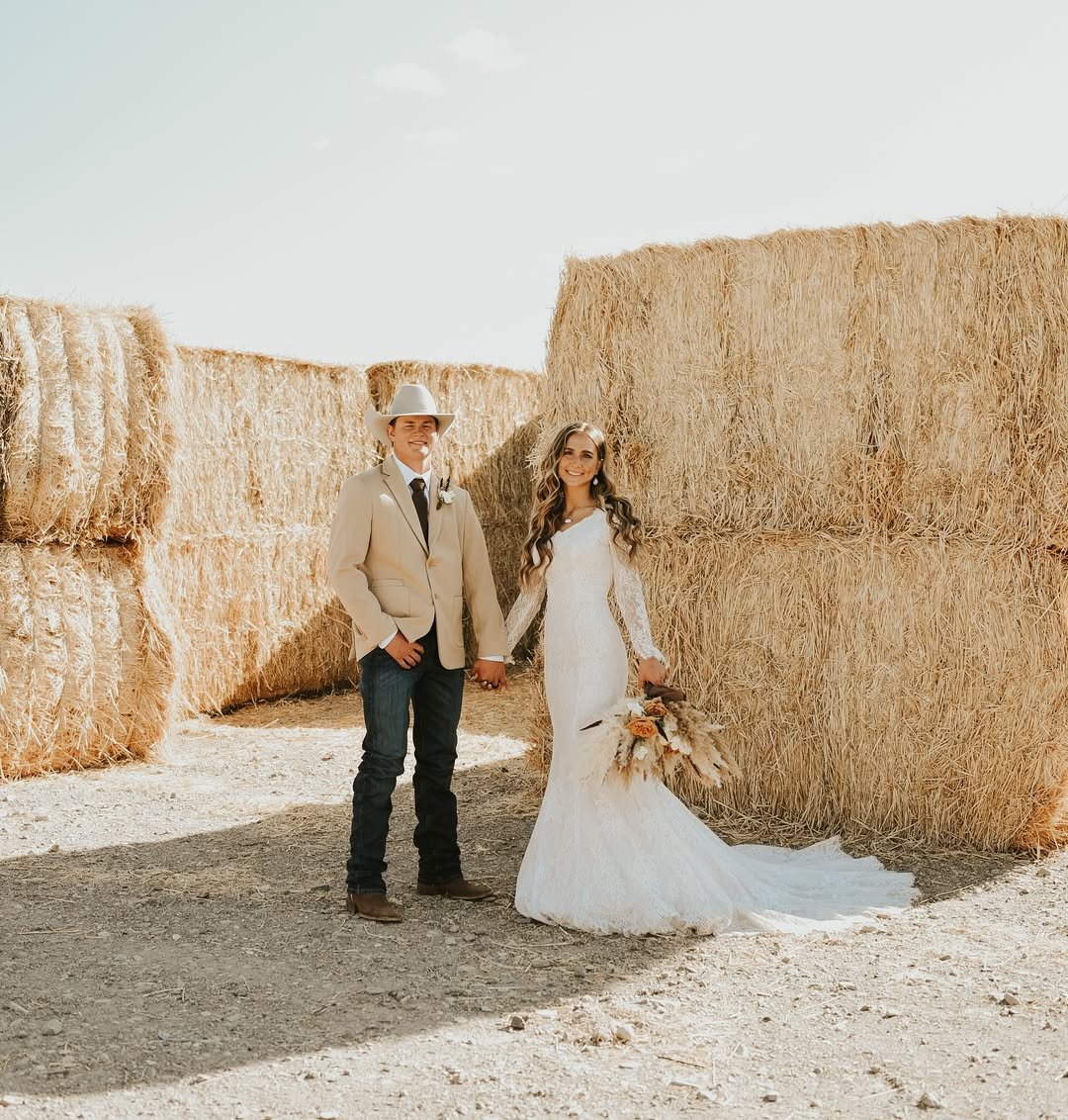 Big love, big sky, and even bigger stacks of hay. This couple nailed the “ranch wedding, but make it runway” vibe. Her lace gown skims the dirt in the best way, while his cream blazer and cowboy hat combo is peak cowboy-cool.