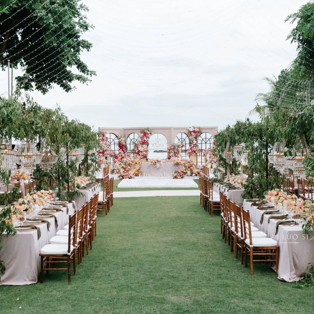 Imagine sipping champagne under cascading chandeliers, surrounded by lush greenery, blushy blooms, and windows that frame the ocean like a dream. It’s giving Marie Antoinette meets tropical garden soirée — which, quite frankly, is now the wedding theme I didn’t know I needed.