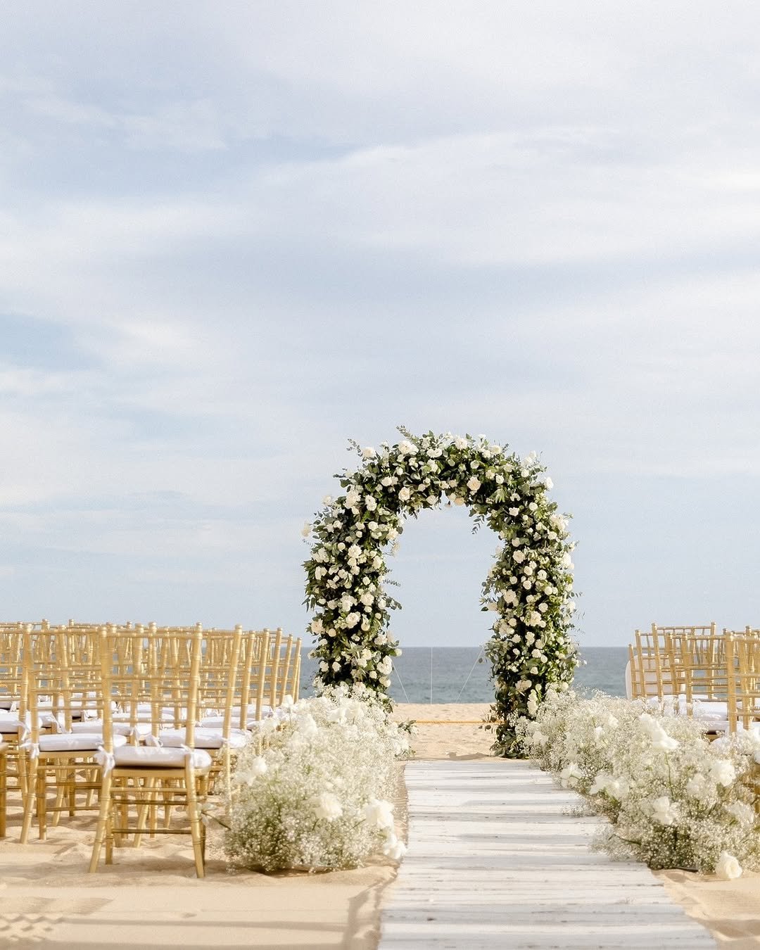 This dreamy beachfront setup by @pueblobonitoweddings brings all the romance of a coastal elopement — delicate baby’s breath clouds lining the aisle, a floral arch that’s practically glowing, and those golden chairs giving a hint of glam (without competing with the view).