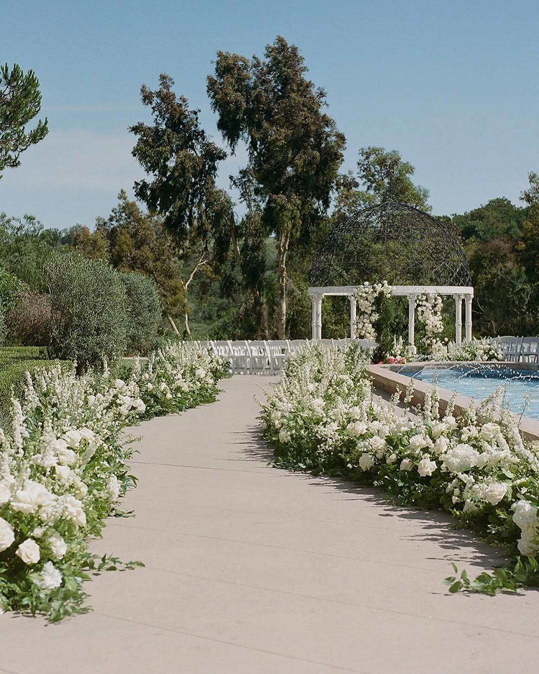 This breathtaking walkway by @mchoneevents wraps around the pool in a sea of white flowers that feel effortlessly lush and almost too perfect to be real (but yes, those petals are real and yes, we’re swooning). The contrast of crisp florals against soft greenery and sky feels like a deep breath of fresh air before the vows.