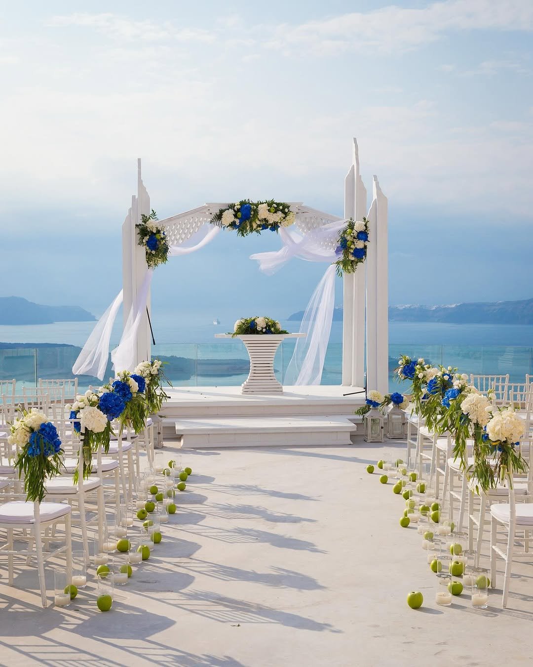 @bluvows brought the Santorini sparkle with this all-white ceremony washed in ocean blues and little green apples lining the aisle (yes, apples — unexpected, adorable, and I’m weirdly into it). The soft breeze through those sheer drapes? Practically begging for a slow-mo veil moment.