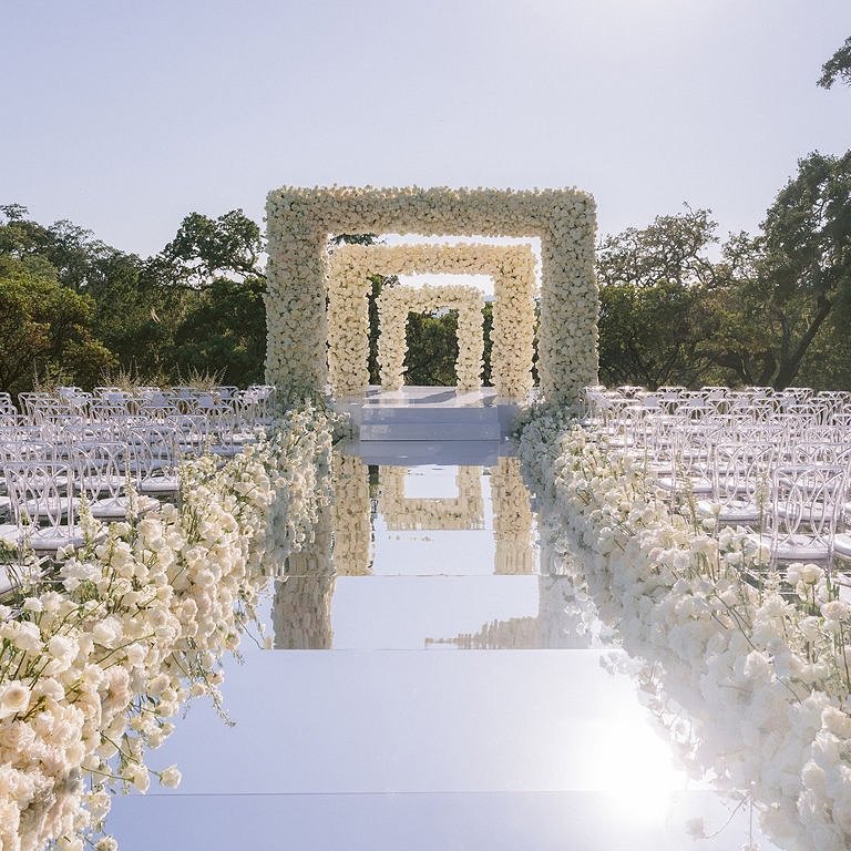 Leave it to @coledrakeevents to transform a Napa hillside into an optical illusion of floral dreams. I mean, mirrored aisle? Framed floral portals? The whole setup feels like stepping into a couture daydream where the dress code is strictly “ethereal goddess.”