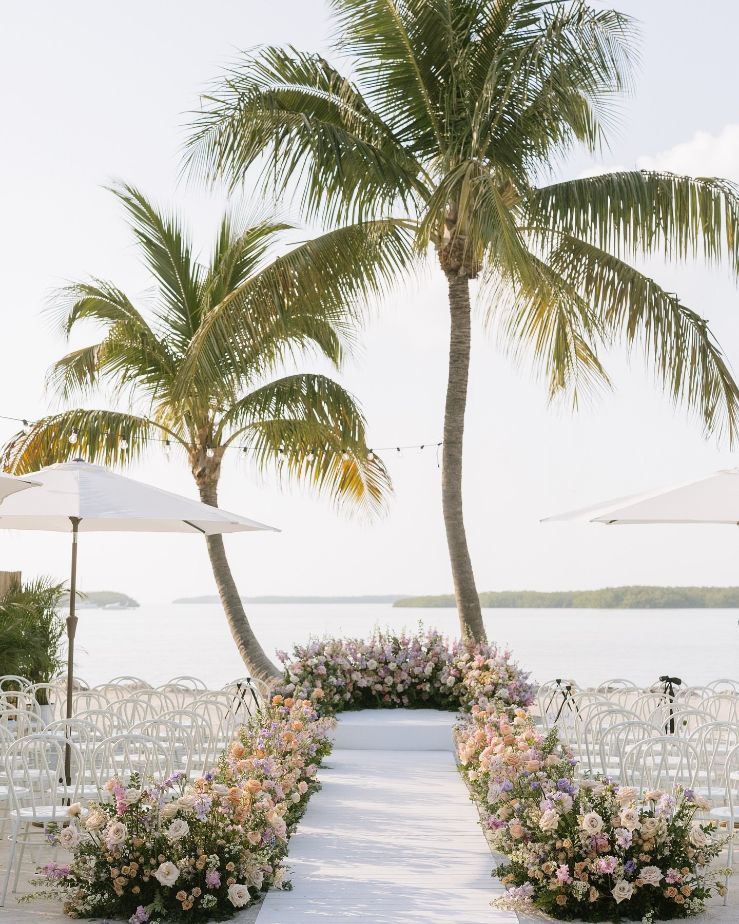 Created by the ever-dreamy team at @bluewaterweddings, this coastal ceremony setup feels like a whisper of a watercolor painting brought to life. The soft pastel florals spill down the aisle like a floral runway, with the ocean horizon framed perfectly by palm trees swaying like they know it’s a special day.