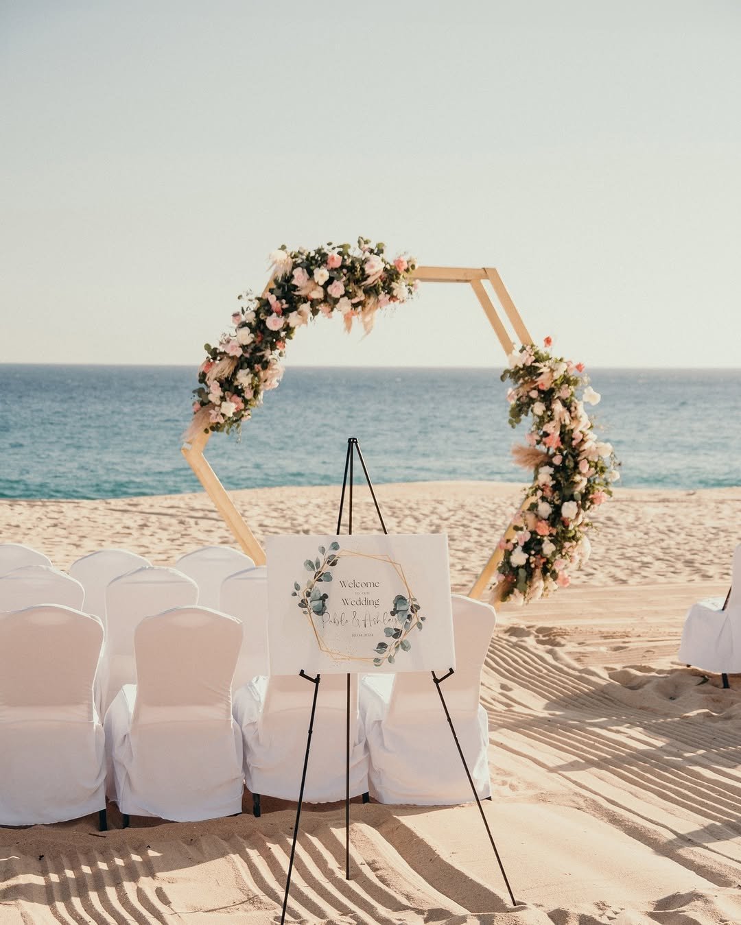 I’m obsessed with the geometric arch dripping in soft blush florals — it adds just the right dose of structure to all that sun-kissed serenity. The gentle slope of the beach, the golden light, the rows of chairs dressed in white — it’s calm, chic, and completely swoon-worthy.