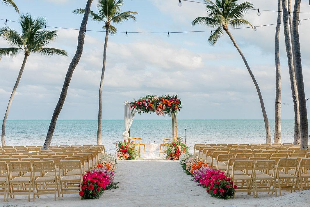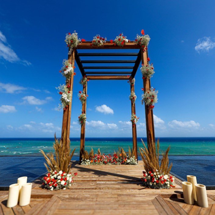 And that floral arch? Cascading white florals so lush they practically drip romance. It’s modern luxury meets oceanside magic, and honestly, if your vows aren’t echoing off palm trees and infinity pools, are you even on vacation?
