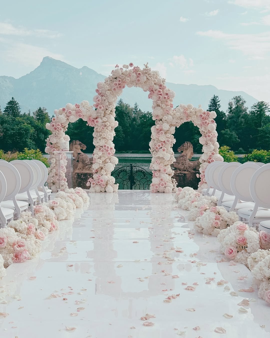 A blush-toned dream set at the foot of the mountains, this aisle is a storybook vision of soft elegance. Billowing arches of ivory and pink roses rise like floral clouds, guiding guests toward vows nestled in nature’s grandeur.