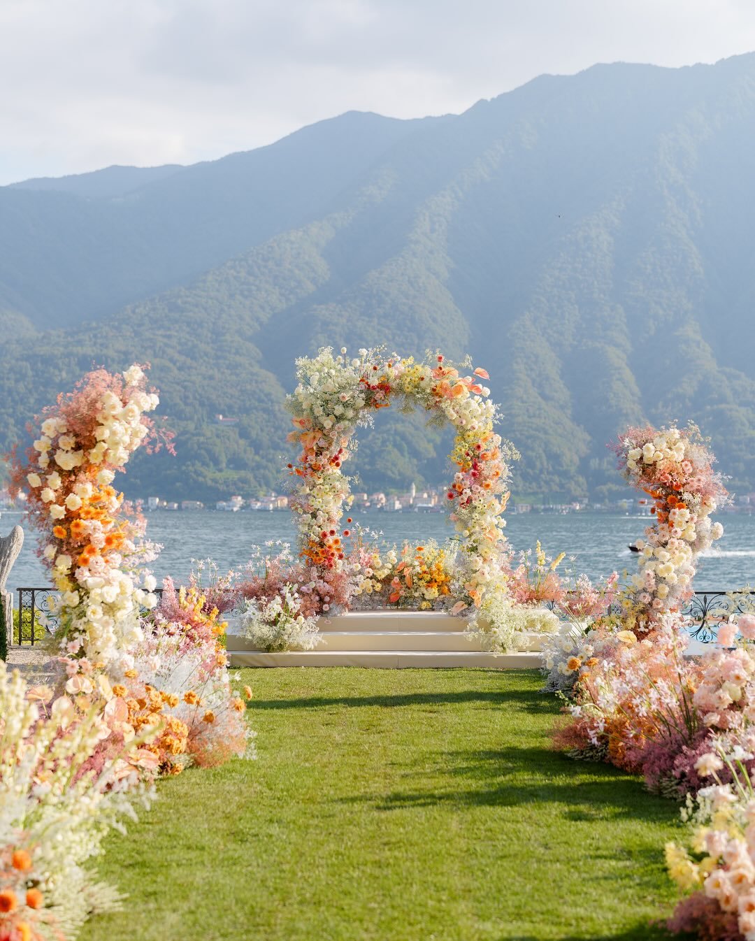 Framed by misty blue mountains and the shimmer of lake waters, this floral aisle feels like walking into a dream. Bursting with apricot, blush, and buttercream blooms, the archway rises like a watercolor painting come to life.