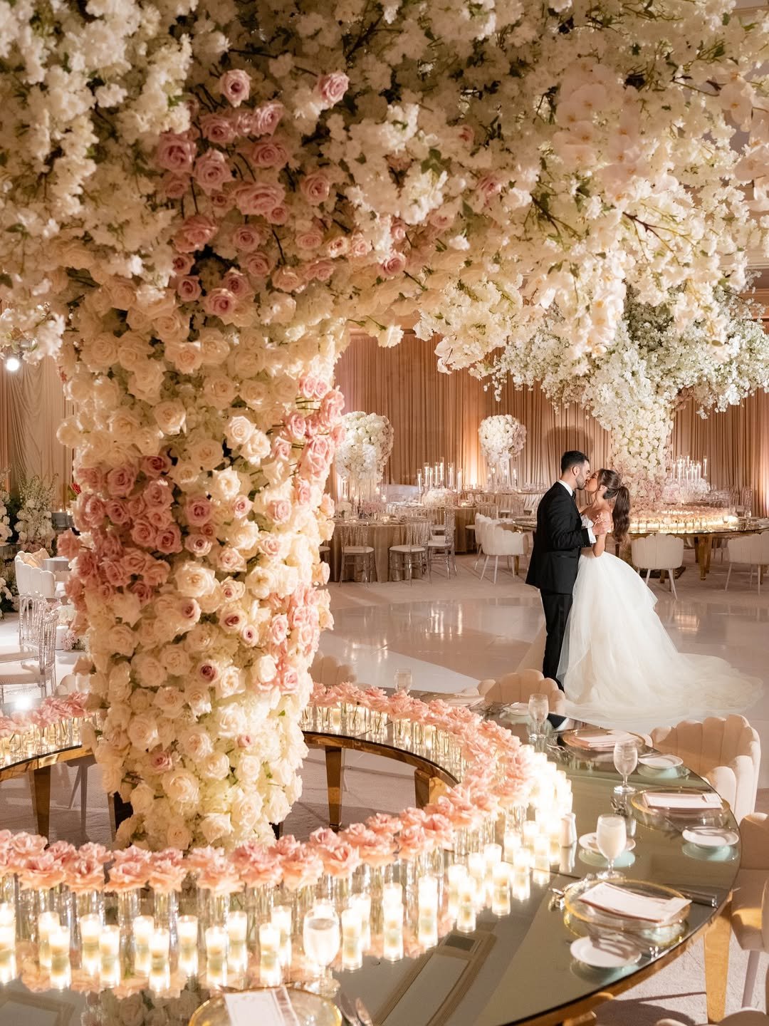 An enchanted garden brought indoors, this floral wonderland wraps guests in cascading petals and candlelit warmth. Towering trees of blush roses and cherry blossoms anchor the room with breathtaking drama, their blooms spilling into mirrored tables like a fairytale forest in full bloom.