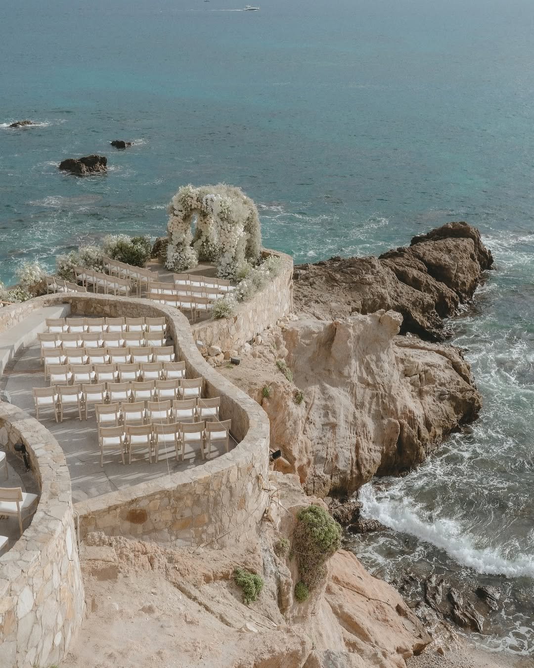 Perched high above the sea, this breathtaking ceremony spot feels like it was carved from a dream. Natural stone terraces wind gracefully toward an ethereal floral arch, its soft white blooms echoing the waves below.