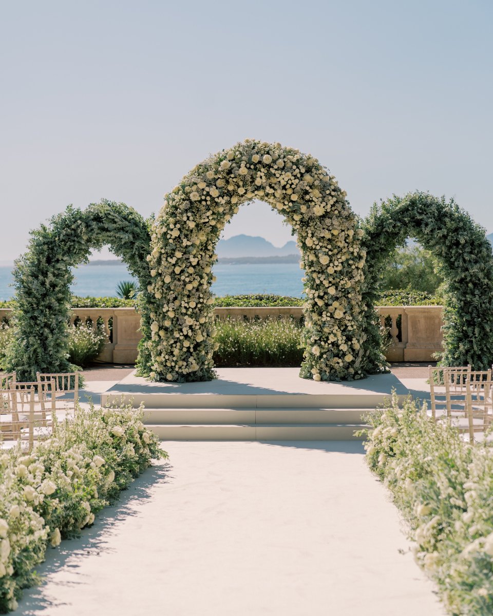 Set high above a sapphire sea, these triple floral arches bloom like poetry against the horizon. Clusters of ivory roses and silvery greenery spill from each curve, soft and sculptural all at once.