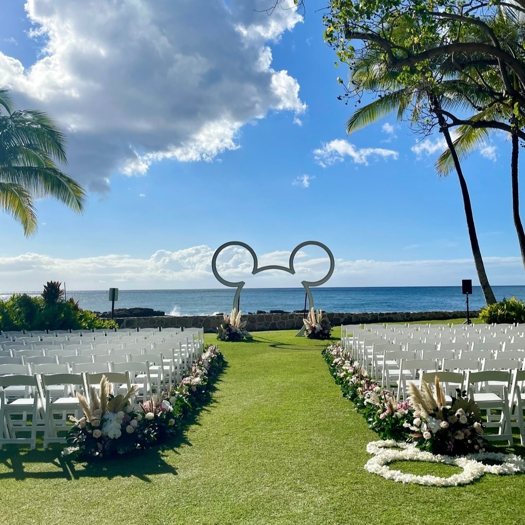 With the sparkle of the sea as its backdrop and that iconic silhouette at center stage, this ceremony setup is pure magic. Rows of crisp white chairs lead to a playful Mickey arch, flanked by blush florals and soft pampas — a subtle nod to fairytales under palm-fringed skies.