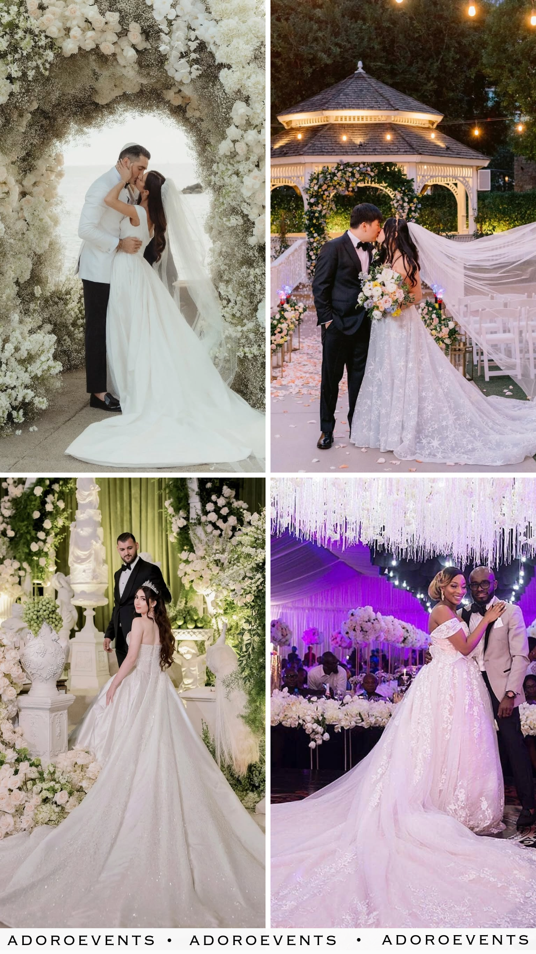 Beneath a string of golden lights and the soft blush of dusk, this romantic gazebo moment feels like it was plucked straight from a fairytale. The couple shares a quiet kiss, surrounded by trailing petals, dreamy blooms, and whimsical lanterns lining the aisle.