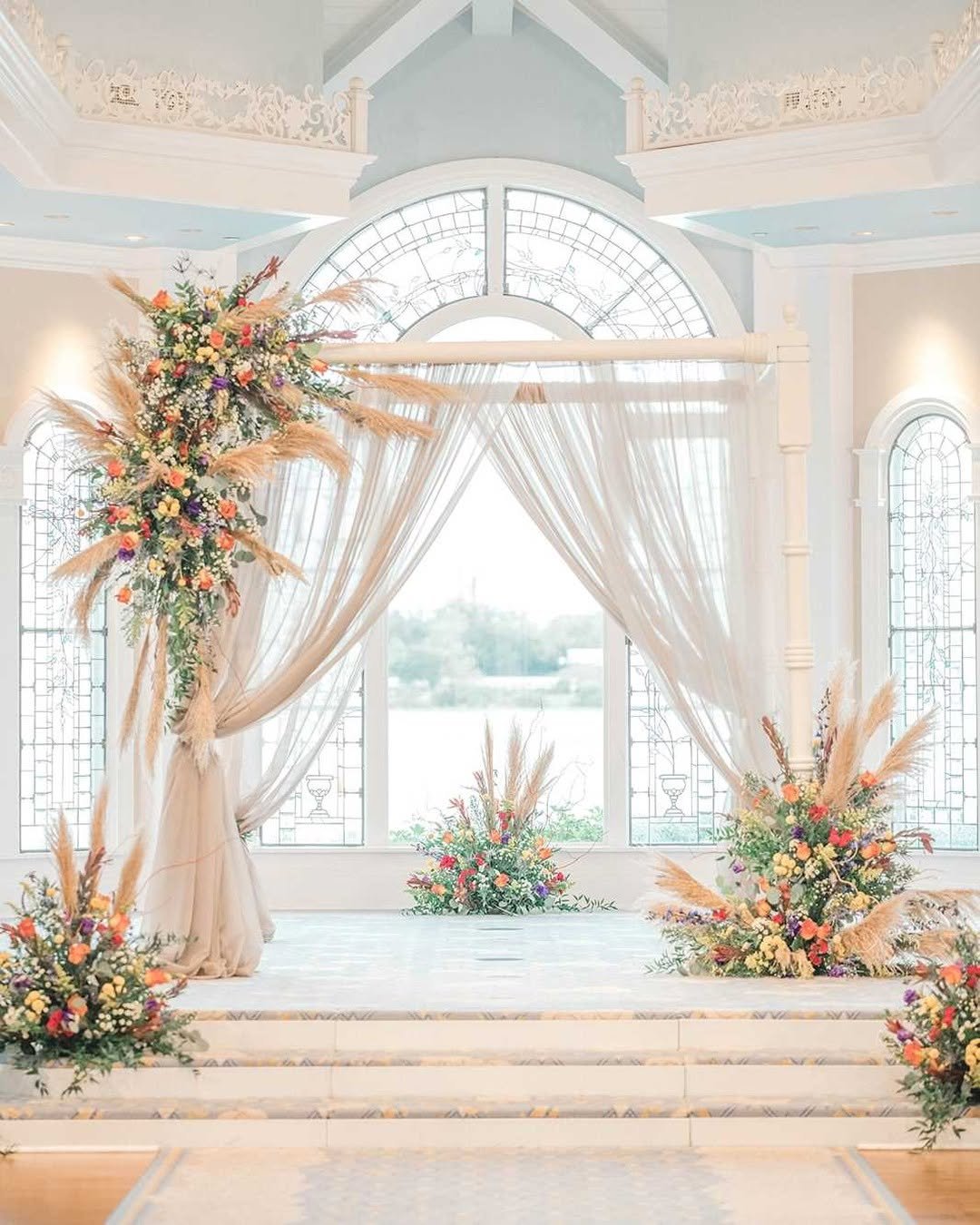 Bathed in soft light and framed by sweeping stained glass, this ceremony setup feels like a breath of magic. Gauzy drapes spill from a white wooden arbor, fluttering like whispers above beds of wildflowers and golden pampas.
