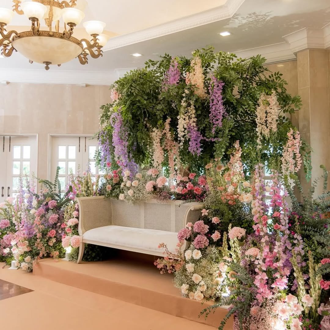A quiet nook blooms into a fairytale. Cascading wisteria and blush-hued roses spill like a secret garden in full song, framing a woven loveseat made for whispered moments and shared glances.