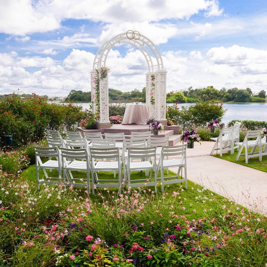 Nestled beside a sparkling lake and surrounded by a flurry of wild blooms, this intimate garden altar feels like a page from a storybook. The white filigree arch, topped with golden rings, stands elegantly amid lush florals and painterly skies.