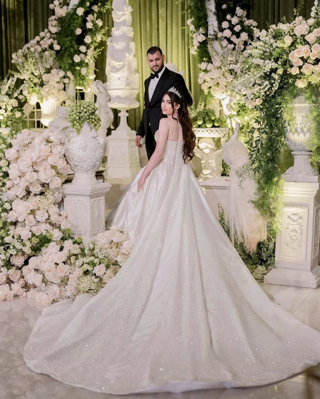 Her tiara catches the light like a secret whispered to the stars, and he waits just behind—elegant, unwavering. It’s a portrait of love set in a garden fit for royalty, where every detail hums with timeless luxury.