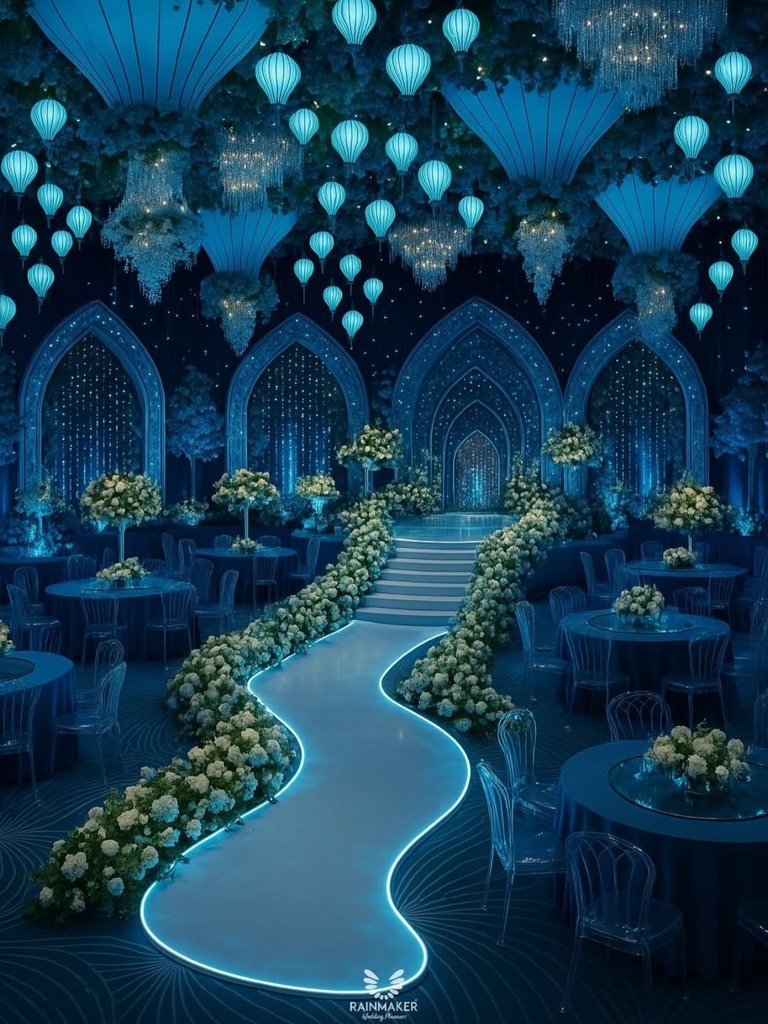A dreamscape wrapped in sapphire light, this otherworldly aisle winds like a glowing river through a moonlit forest. Suspended lanterns and crystal chandeliers drip from above, casting soft starlight on every corner of the room.