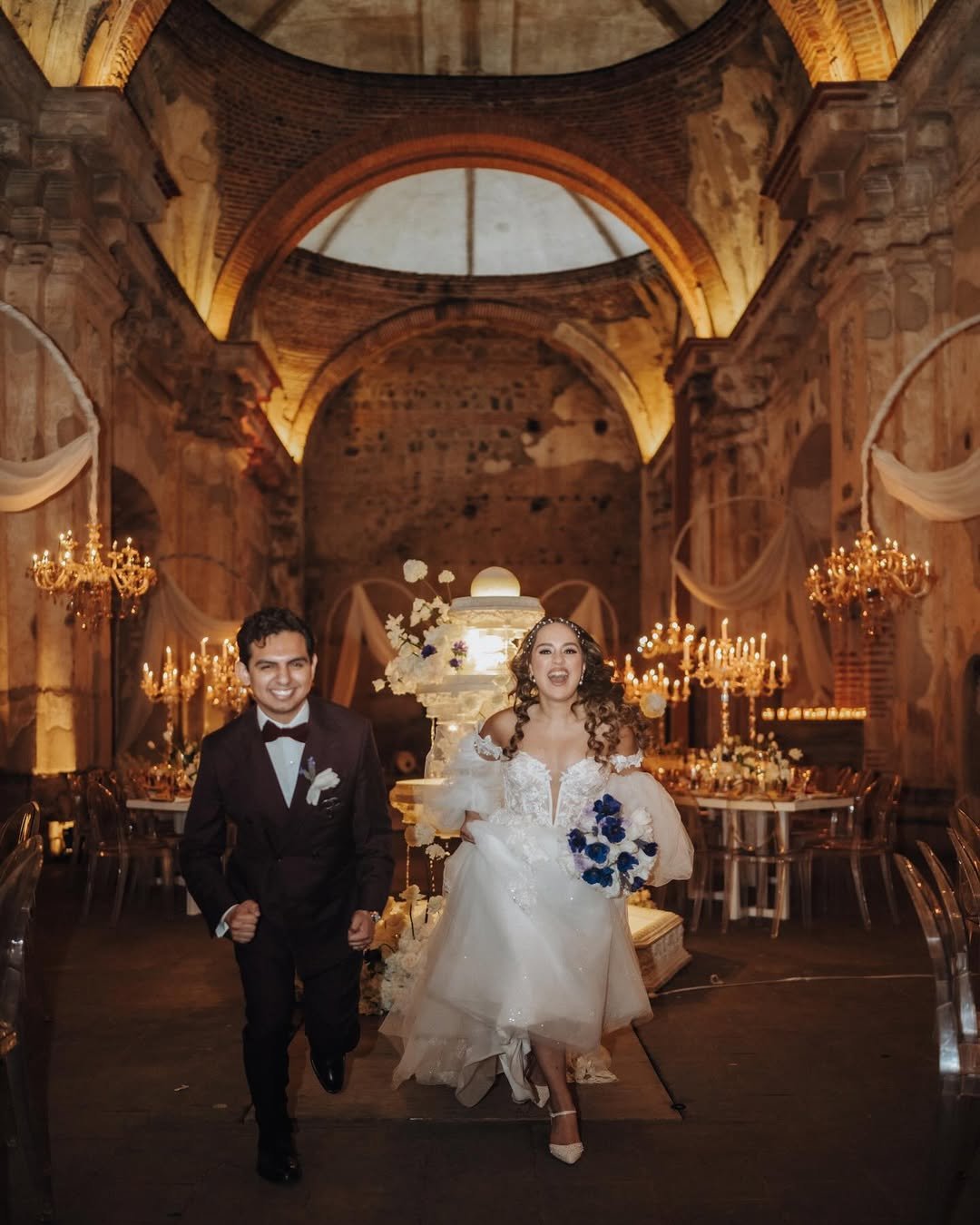 In a candlelit hall echoing with centuries of stories, this couple brings joy and movement to a space steeped in grandeur. Arched ceilings, golden chandeliers, and a fountain altar set the stage — but it’s their radiant smiles and full-hearted sprint that steal the moment.