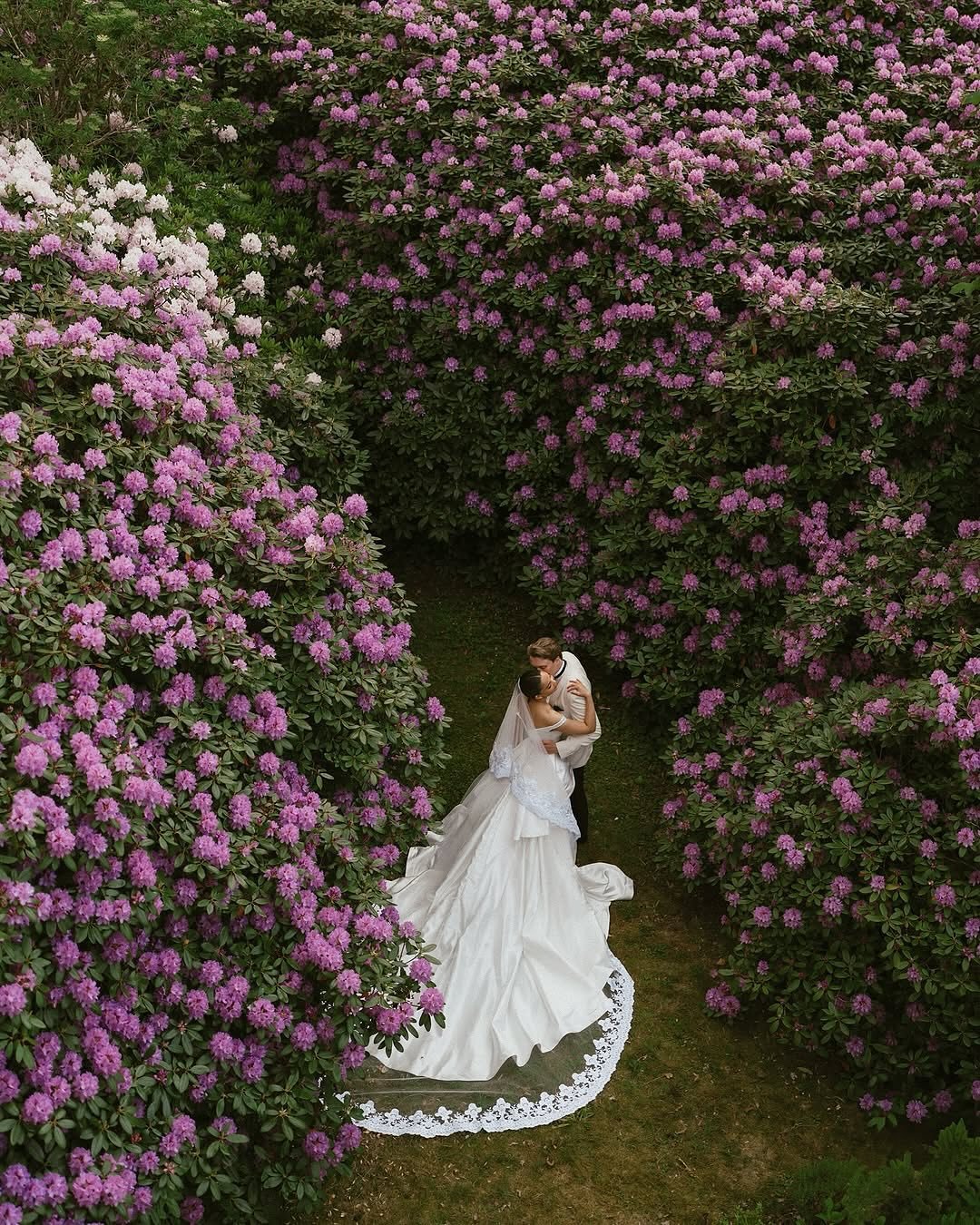 Tucked within a sea of blooming lilac and blush-toned rhododendrons, this moment feels like it bloomed straight from a fairytale. The bride’s satin gown spills across the grass like a waterfall of ivory silk, her embroidered veil trailing behind in quiet grandeur.