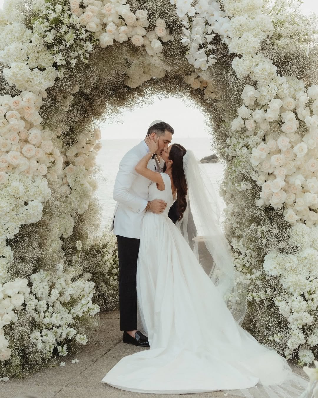 There’s something timeless about a love sealed beneath a canopy of blooms. This floral arch, bursting with soft ivory roses, hydrangeas, and a whisper of baby’s breath, feels like nature’s blessing — a living sculpture framing the couple’s kiss against a pale ocean horizon.
