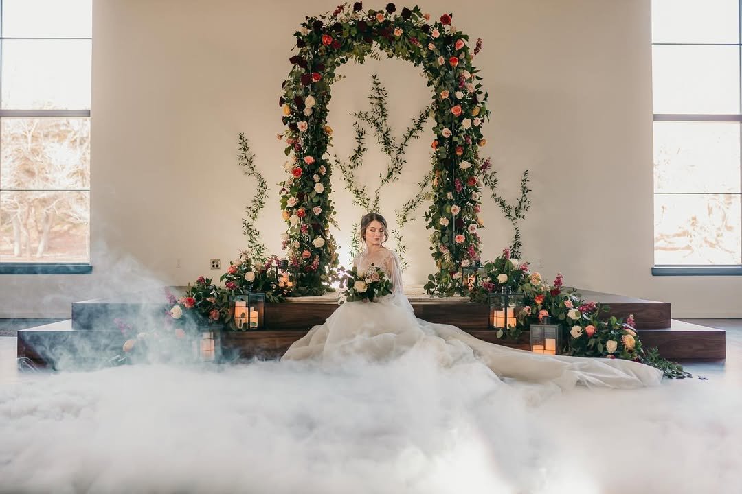 A cloud of mist curls at her feet, as if the earth itself is holding its breath. Framed by a wild floral arch bursting with moody garden roses and climbing greens, this bride sits like a dream—soft, serene, and untouchable.