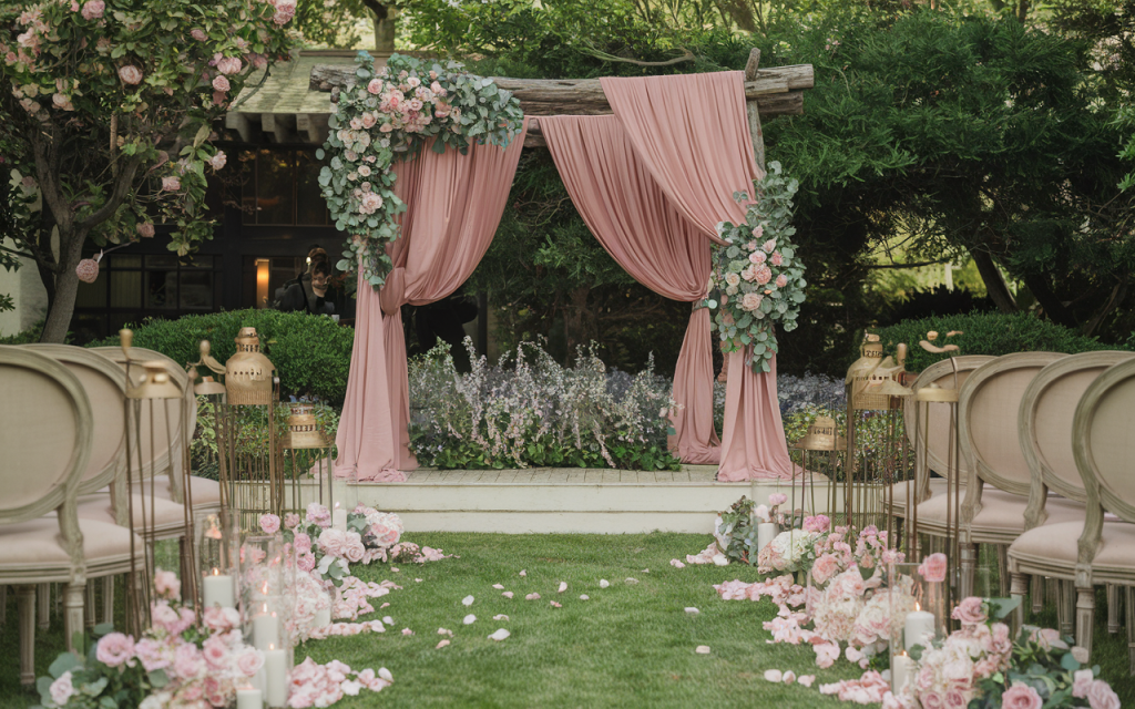 Nestled within a lush garden, Blush Garden Romance is a ceremony space that feels like stepping into a dream. Gentle hues of dusty rose and soft greenery frame an intimate altar, where draped fabric cascades from a rustic wooden arch, blending nature’s raw beauty with delicate sophistication.