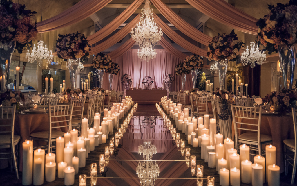Every element, from the candlelit glow to the plush floral arrangements, evokes a timeless romance—an ethereal dreamscape designed for a love story that shines as brilliantly as the chandeliers above.