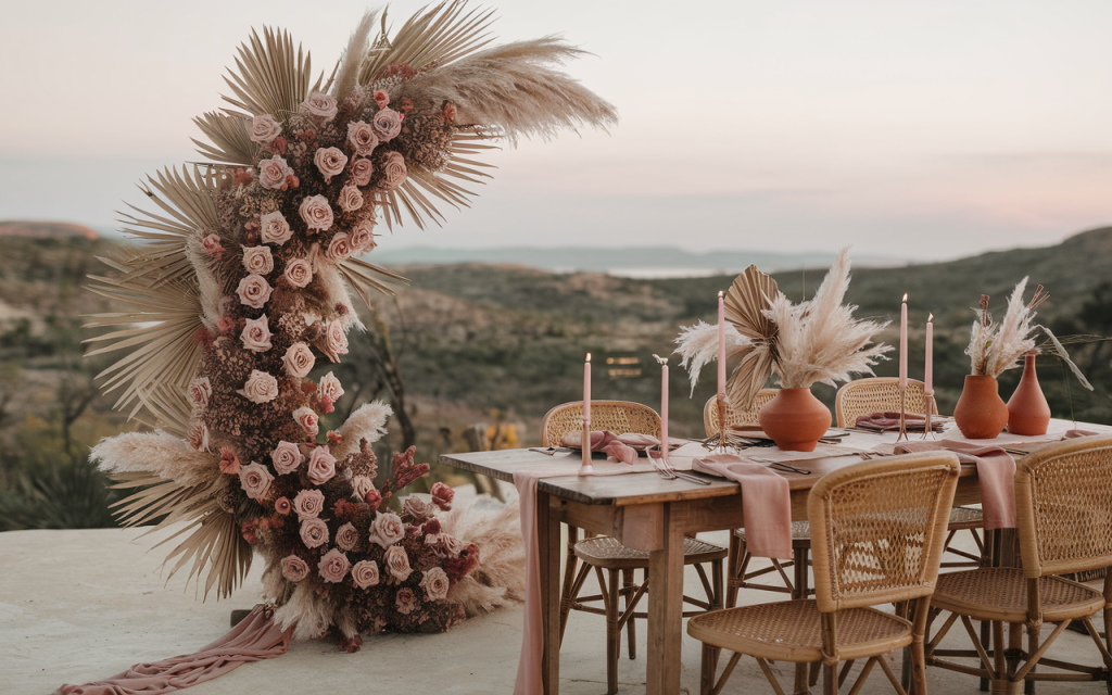 A mesmerizing crescent floral installation weaves together dried palm fronds, feathery pampas grass, and muted blush roses, creating an otherworldly focal point. The delicate interplay of textures—wispy plumes against structured botanicals—mirrors the vast landscape beyond, where rolling hills meet the horizon in soft gradients of dusk.