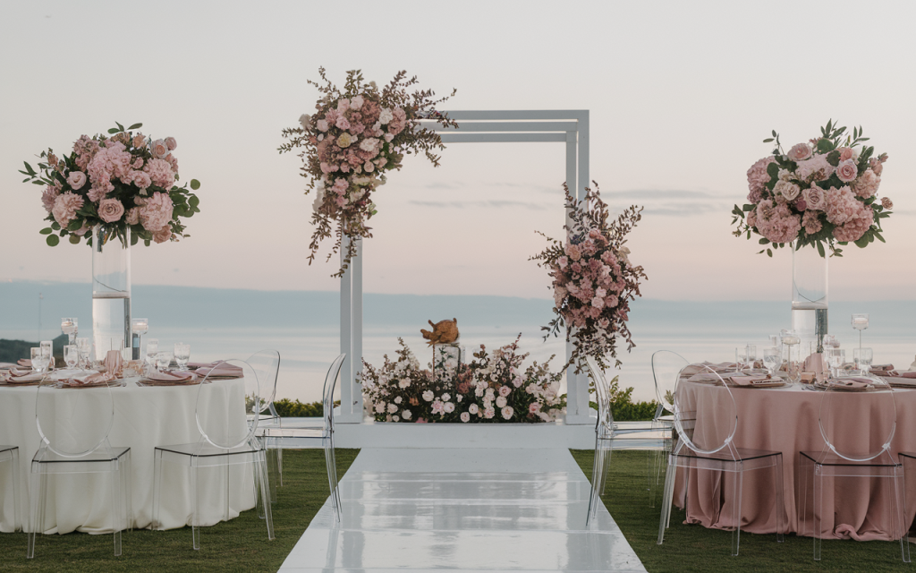 The Ethereal Elegance wedding setup feels like a dream suspended in time—a delicate union of modern simplicity and timeless romance. With the ocean stretching infinitely beyond, the ceremony unfolds under the soft glow of dusk, where the sky meets the sea in a seamless whisper of pastels.