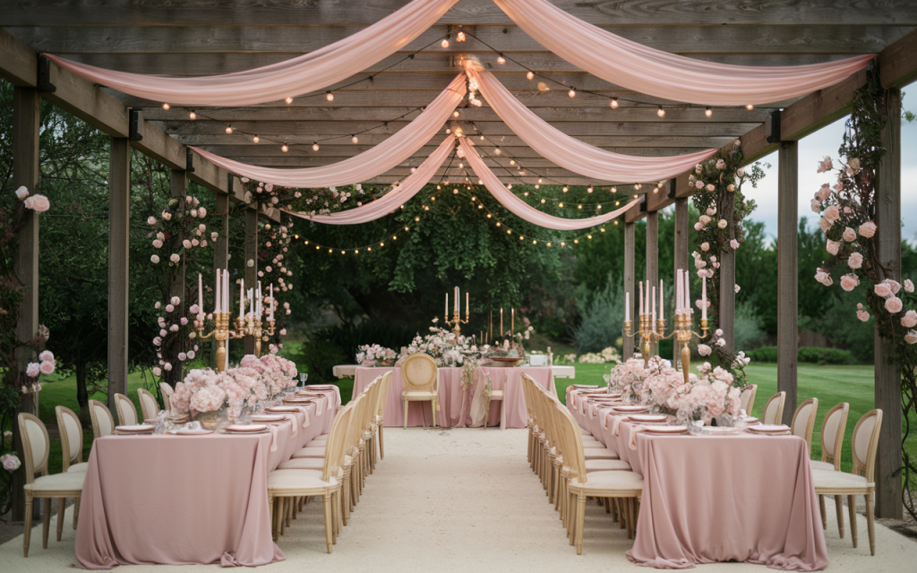 The Ethereal Garden Elegance wedding setting is a dream woven in soft pink and golden glow, where romance lingers in the air like the scent of fresh roses. Beneath a rustic wooden pergola, draped in cascading blush chiffon, warm fairy lights twinkle like fireflies, creating an ambiance that is both intimate and enchanting.