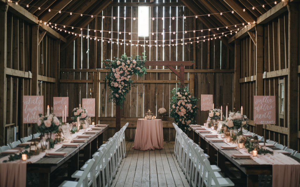 Under the warm glow of string lights, this Rustic Elegance wedding scene blends the raw beauty of weathered wood with the soft, romantic hues of blush pink and delicate florals. There’s an undeniable intimacy in the way natural textures and candlelit details weave together, creating a setting that feels both cozy and refined.