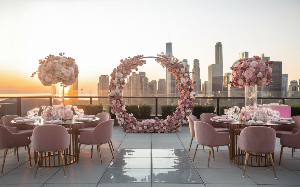 At the heart of the scene, a breathtaking circular floral arch—lush with cascading roses and hydrangeas—frames the city’s towering skyline, making it the perfect backdrop for an unforgettable “I do.” Plush dusty pink chairs encircle glass-topped tables, where delicate floral arrangements and gleaming crystal stemware capture the light of the setting sun.