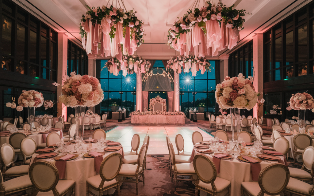The Grand Ballroom Affair is an opulent masterpiece, where romance meets regal splendor. Bathed in soft pink hues, the ambiance is nothing short of a fairytale, enveloping guests in a world of elegance and enchantment. The interplay of golden accents and cascading floral arrangements transforms the space into a dreamscape fit for a royal celebration.