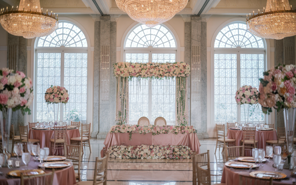 The sweetheart table, a vision in blush and cascading blooms, is crowned by a canopy of lush florals and crystal accents that shimmer like dewdrops. Towering arrangements of ivory and blush roses grace each table, their soft petals mirroring the exquisite textures of the draped linens and golden charger plates.
