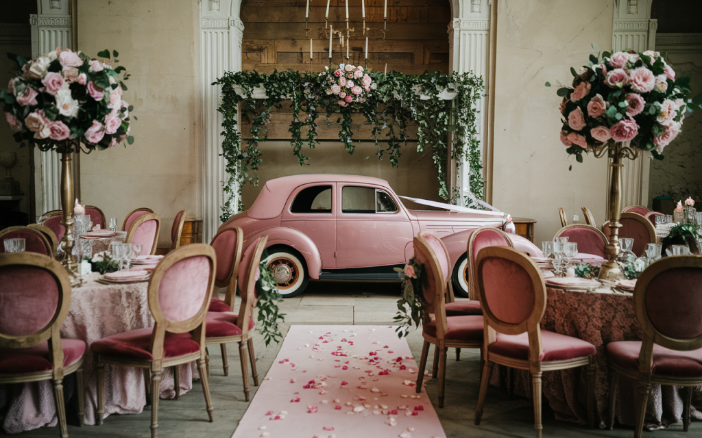 A charming dusty pink vintage car serves as the focal point, draped in soft ribbons, embodying the spirit of old-world romance. The warm glow of antique chandeliers casts a golden hue over plush velvet chairs, delicate lace-draped tables, and grand floral arrangements overflowing with soft pink roses and lush greenery. Every element whispers of a bygone era, where love letters were penned by candlelight and celebrations were drenched in elegance.