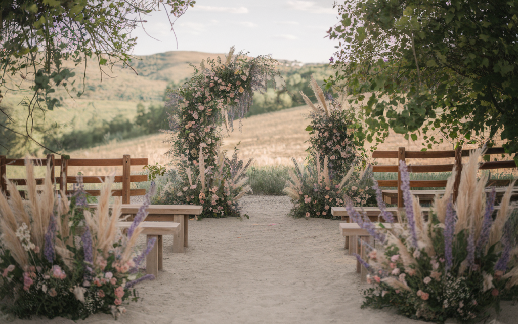 The focal point—a floral arch of cascading greenery, delicate blush roses, and wisps of lavender—frames the scenic backdrop, making every moment feel like a painting come to life. Pampas grass and soft lilac florals spill from the aisle, adding texture and movement to the rustic wooden benches, where guests gather beneath the canopy of leaves.