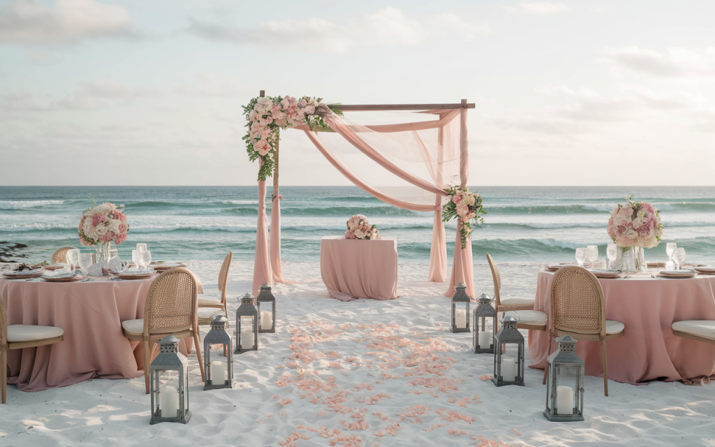 Lanterns line the sandy aisle, their flickering candlelight casting a warm glow as the sun kisses the horizon. Guests are seated at intimate tables, their settings framed by woven rattan chairs and cascading floral centerpieces, perfectly complementing the sea’s endless blue.