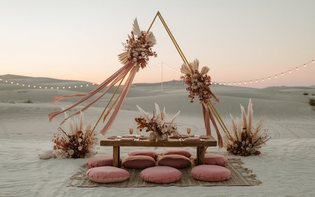 At the heart of this oasis, a rustic wooden table sits low against the dunes, surrounded by plush rose-hued cushions that invite guests to settle in under the open sky. A striking geometric arch, adorned with cascading dried florals and flowing ribbons, catches the gentle desert breeze, adding movement to the serene landscape.