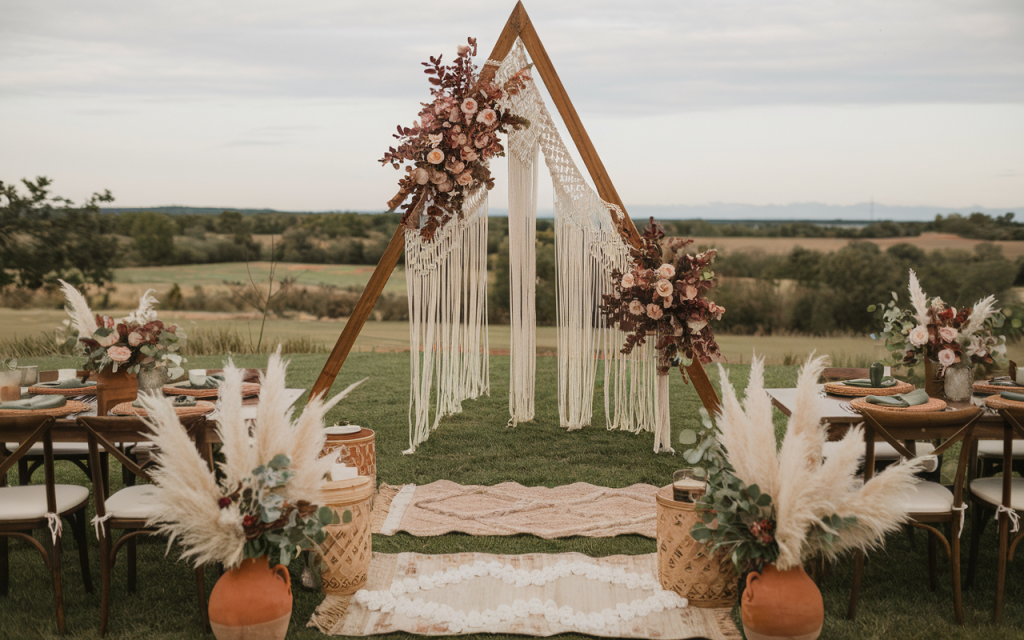 At the heart of the scene stands a striking wooden triangle arch, draped in delicate macramé, its fringes swaying gently with the breeze. Blush-toned florals and dried foliage frame the structure, their earthy hues blending seamlessly with the sunlit meadow beyond. Pampas grass arrangements spill from terracotta vases, their feathery plumes adding softness to the rustic wooden tables adorned with woven chargers and ceramic tableware.