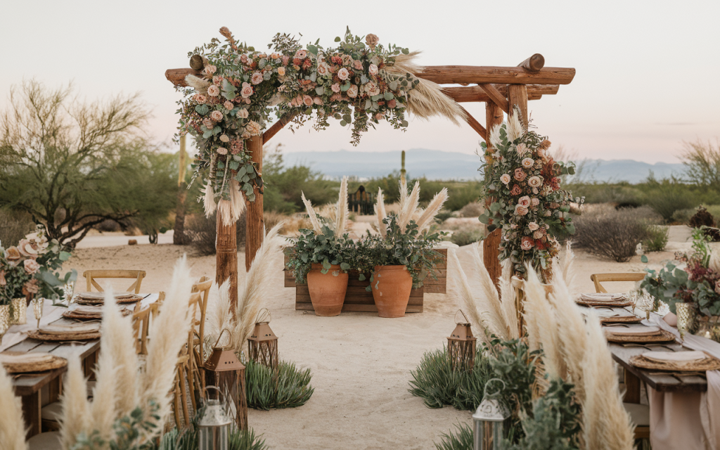 Set against the vast expanse of the desert, this wedding captures the raw beauty of the arid landscape. A handcrafted wooden arch, adorned with cascading eucalyptus, blush-toned roses, and wisps of pampas grass, frames the ceremony space, blending effortlessly with the earth-toned surroundings. The golden hues of sunset cast a soft glow over the scene, enhancing the warmth of the terracotta pots and rustic wooden tables.
