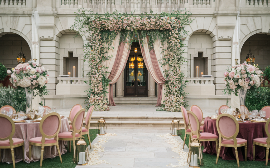 Blush and ivory roses climb the grand entryway, their delicate tendrils weaving an enchanting story of love. Velvet seating in rose and gold hues exudes regal sophistication, while candlelit pathways cast a golden glow beneath the evening sky.