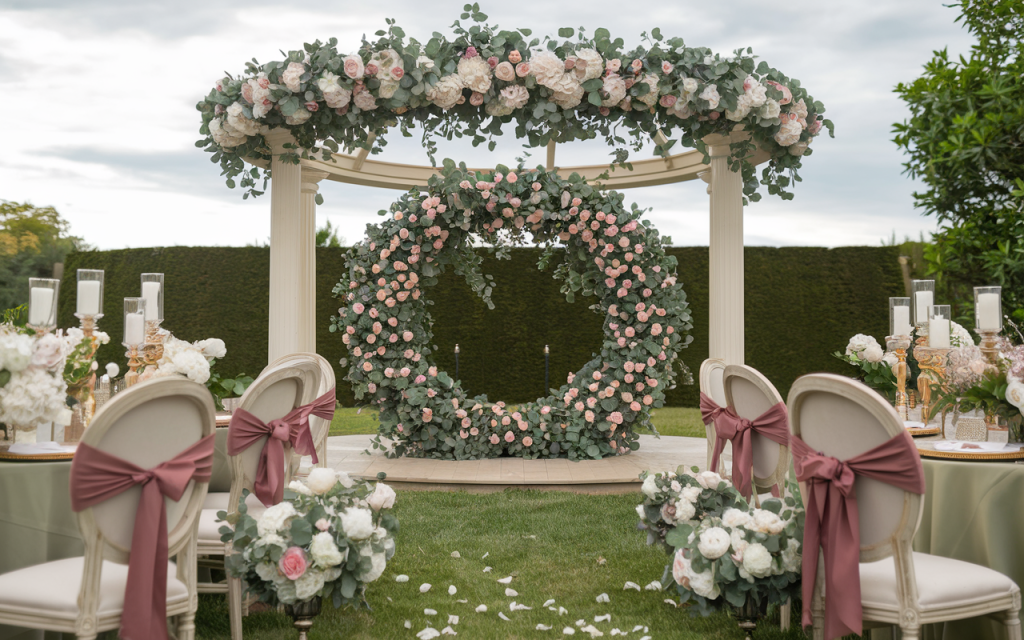 Nestled in a secluded garden, this wedding scene feels like a secret oasis of love. The lush greenery forms a natural sanctuary, while a grand circular floral arch—cascading with soft blush roses and verdant eucalyptus—creates an ethereal focal point for the ceremony.