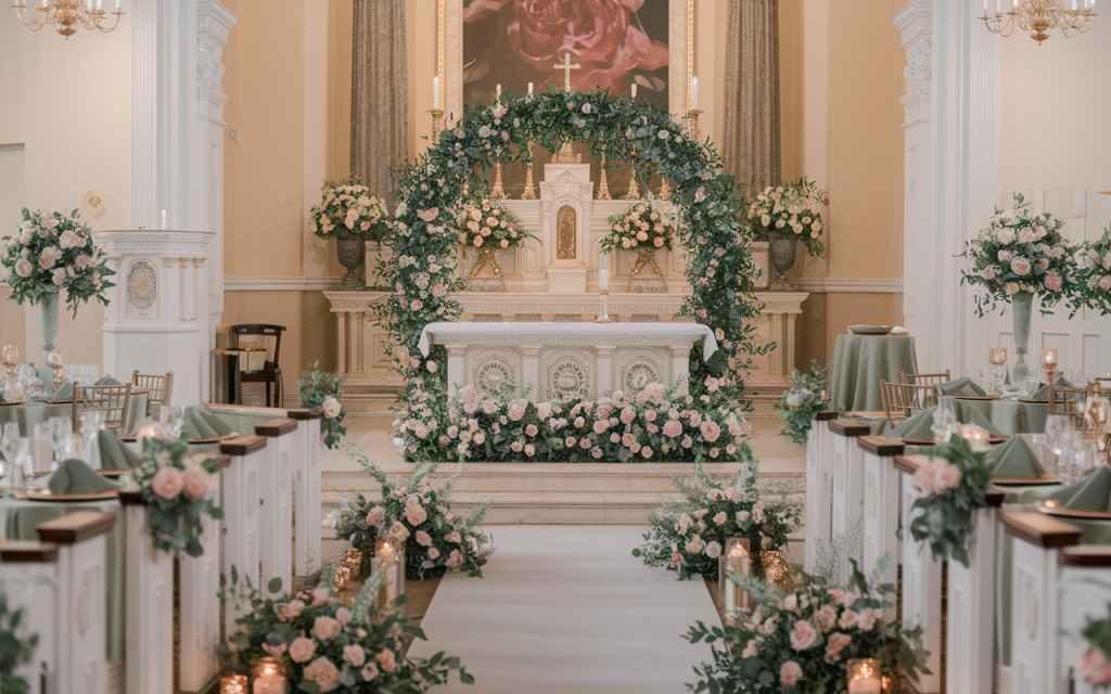 A sweeping aisle, lined with candlelit blooms and soft greenery, leads to the breathtaking altar—adorned with an arch of cascading roses and delicate foliage. The warm glow of chandeliers reflects off the pristine white pews, enhancing the serene ambiance. Muted sage and blush tones complement the church’s ornate detailing, creating a harmony of old-world charm and modern sophistication.