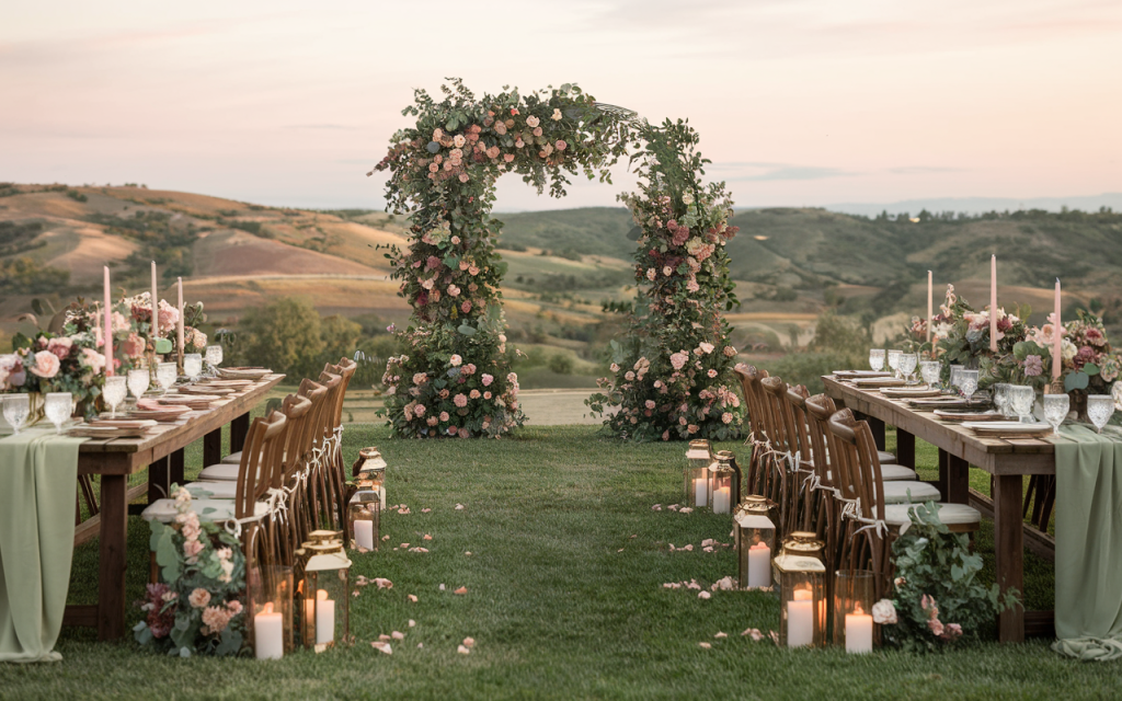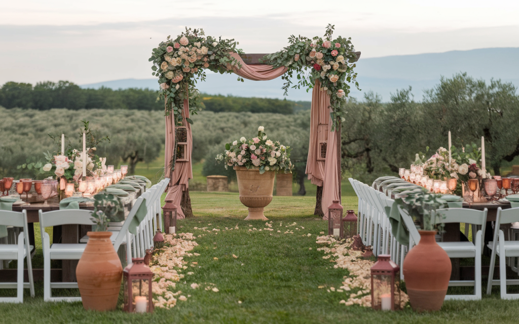 The rolling hills of Tuscany embrace this intimate wedding scene, where timeless romance meets rustic charm. An arched altar draped in soft blush fabric and entwined with cascading greenery stands as a poetic focal point, framing the serene landscape beyond.