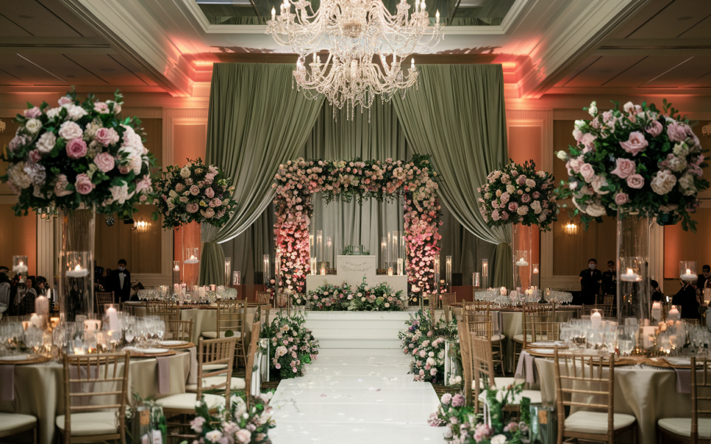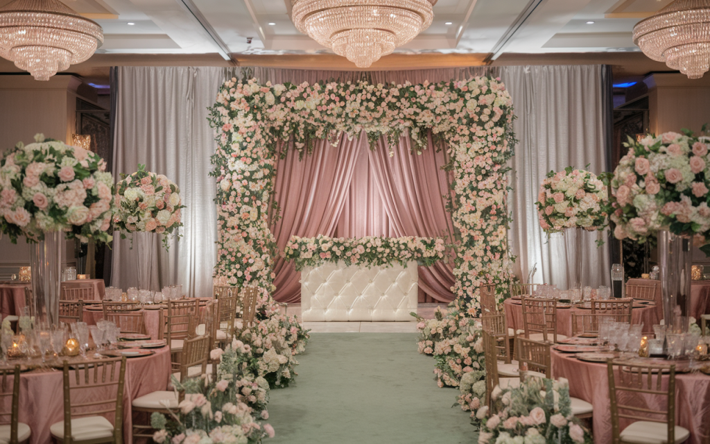 The aisle is framed by lush floral arrangements, leading to a breathtaking sweetheart stage adorned with cascading blooms and silky rose-hued drapery. Gold-accented chairs and candlelit tables create a regal ambiance, while plush velvet linens in dusty rose add a touch of warmth. Towering floral centerpieces in soft pastels bring an ethereal feel, complementing the room’s gilded architecture.